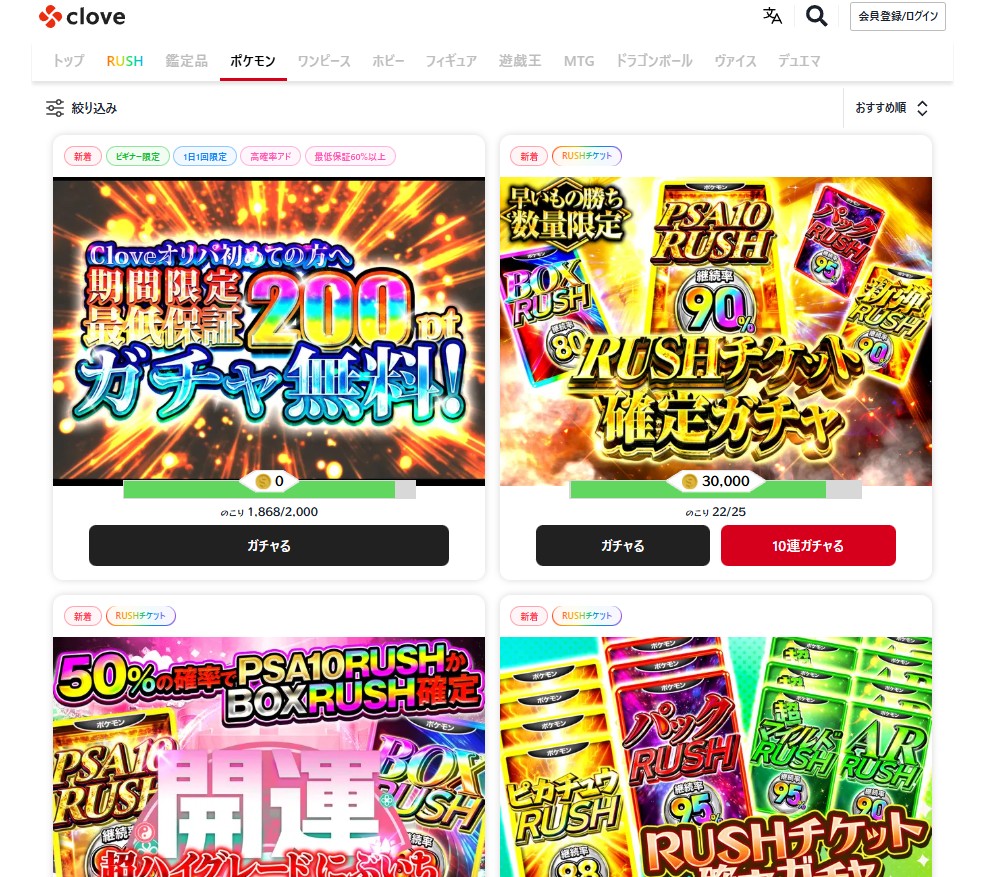 clove(クローブ)は、ネットオリパが今よりもブームになる前から参入している老舗のオリパサイトで主にポケカやワンピースカードなどのトレカを扱っています。
