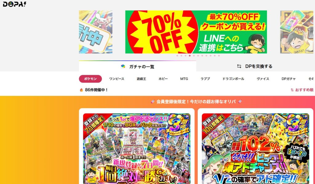 オンラインオリパ「DOPAオリパ」は、常時200種類以上のラインナップと豪華なガチャ演出が人気です。