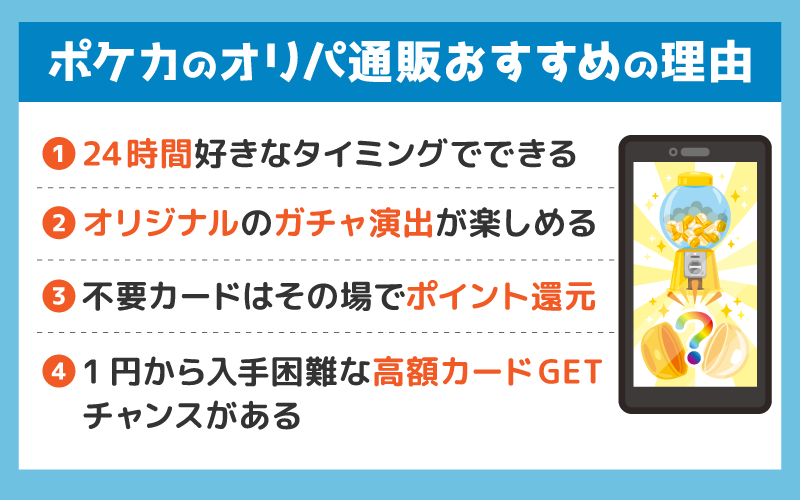 今まではカードショップの店頭でオリパを購入するのが主流でしたが、近年はスマホやPCで24時間いつでも好きな場所で数多くのオリパを楽しむことができるのが、ポケカのネットオリパ(通販)です。