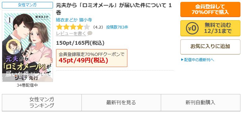 ただし、「元夫から「ロミオメール」が届いた件について」は各電子書籍サイトでもらえるクーポンやポイント還元、セールなどを利用してお得・実質無料で読むことも可能です。